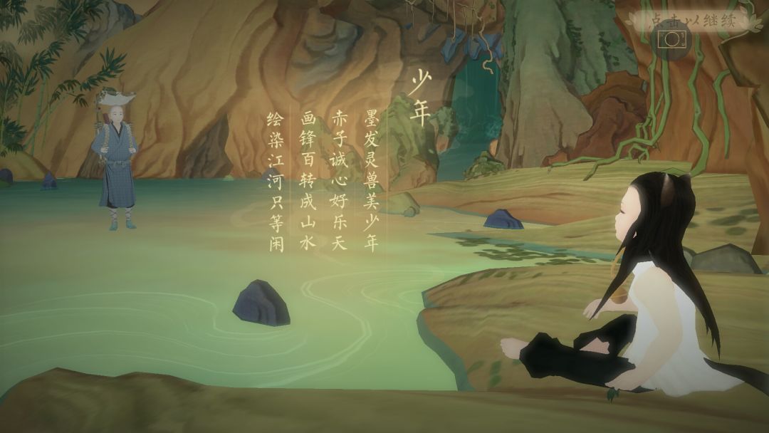 与一修正相反,墨言对于画技丝毫不知。他生于自然,对山川自然间的百转千回,五光十色了然于心。他更能体会到山川草木的感情,即使寻常人看来无情之物,在他眼中则风情万种。他并不知道如何表达这些感情。这也是我给他取名墨言之想,希望他能够以墨为言,借画抒情。
