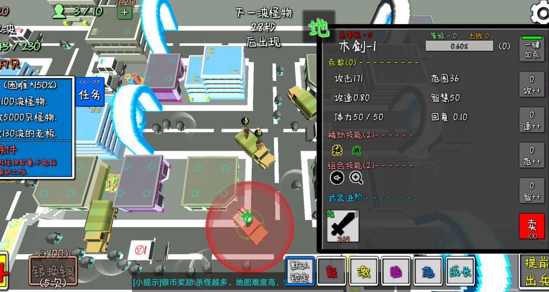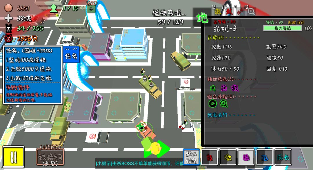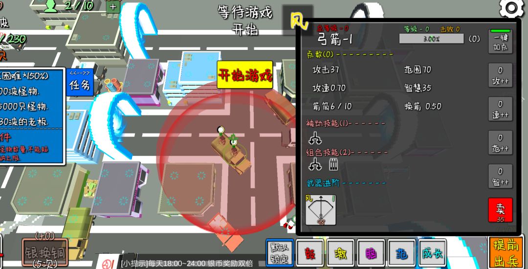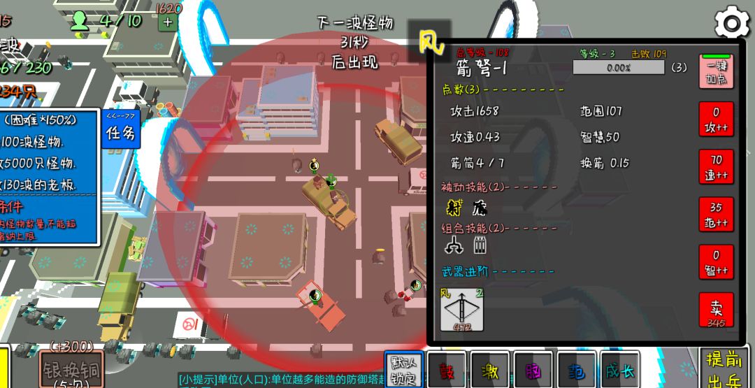 第三步,升级(靠下的)弓(另一个先不升),然后还是加技能,直到升为弩(满级技能10波即可完成)。然后同样方式升靠上那个(细节补充:靠上那个弩点50范围,靠下那个弓点35范围,这样可以确保打到店主控到的boss,店主是全点范围)