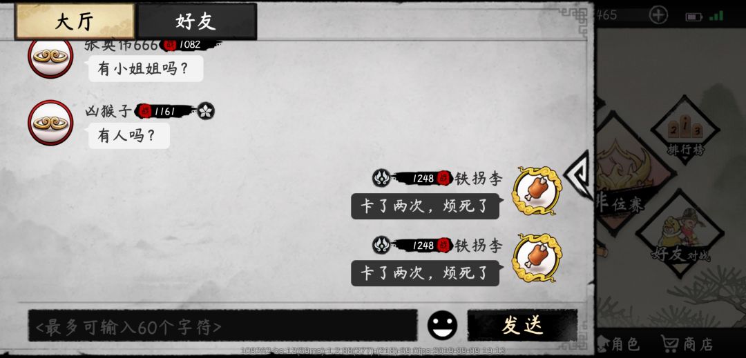 第二个是卡顿,打架的时候啦了两次,大厅发言也卡顿,挺可怕的。
