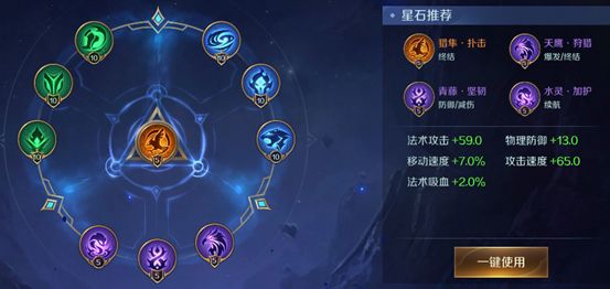 蓝绿星石首选法术攻击、攻击速度和移动速度,提高攻击速度为了配合嫦娥的被动效果,移动速度增加自身机动性。紫色星石推荐天鹰,青藤,水灵,保证生存的同时,提升终结伤害,因为嫦娥是打野英雄,因此带水灵提升野怪BUFF持续时间。橙色星石选择猎隼,配合被动打爆发。