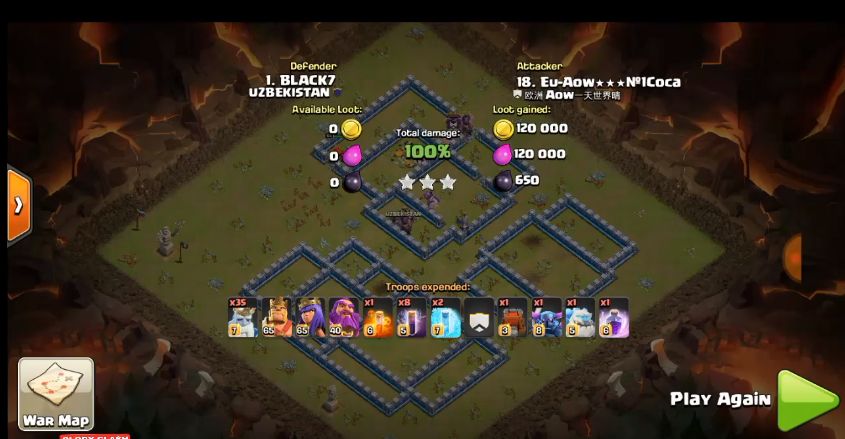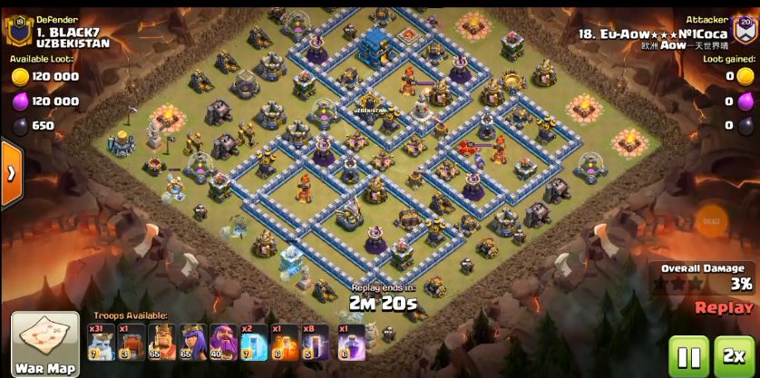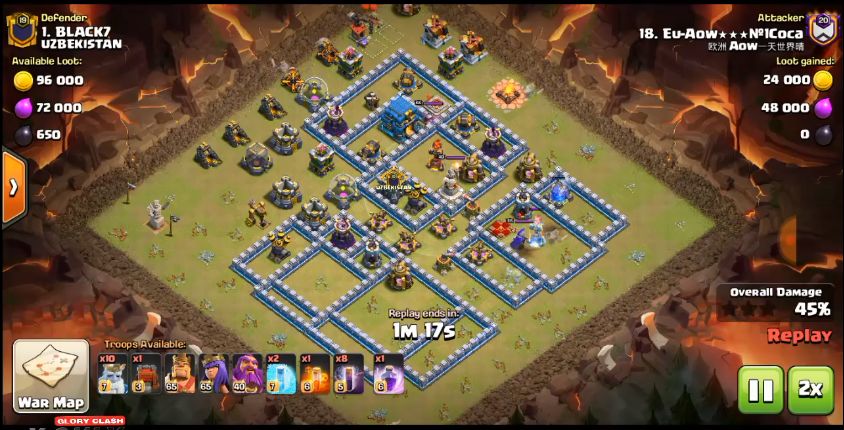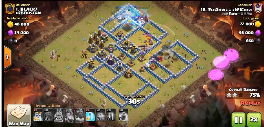 在配兵方面,我们选择纯粹的31个皇室幽灵,法术方面携带1狂暴法术、8蝙蝠法术、2冰冻法术、1毒药法术,援兵方面用的是携带皮卡超人和冰人的攻城战车,用我们的幽灵大部队消灭尽可能多的法师塔和地狱塔后,我们用攻城战车和三王一起拆掉敌方大本营并且杀掉援兵,最后我们再用巨量的蝙蝠法术收尾。