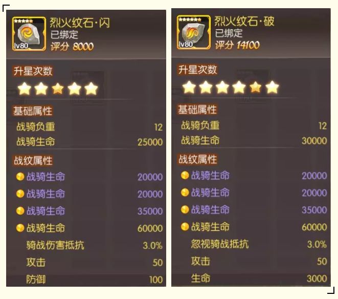 金色战纹共有五种不同类型,其附加属性各不相同。其中,烈火纹石·闪和烈火纹石·破可以提升战骑负重。提升战骑负重总额后,或许你还能将其中一个轻甲替换成铁甲,大幅提升战甲附加属性!