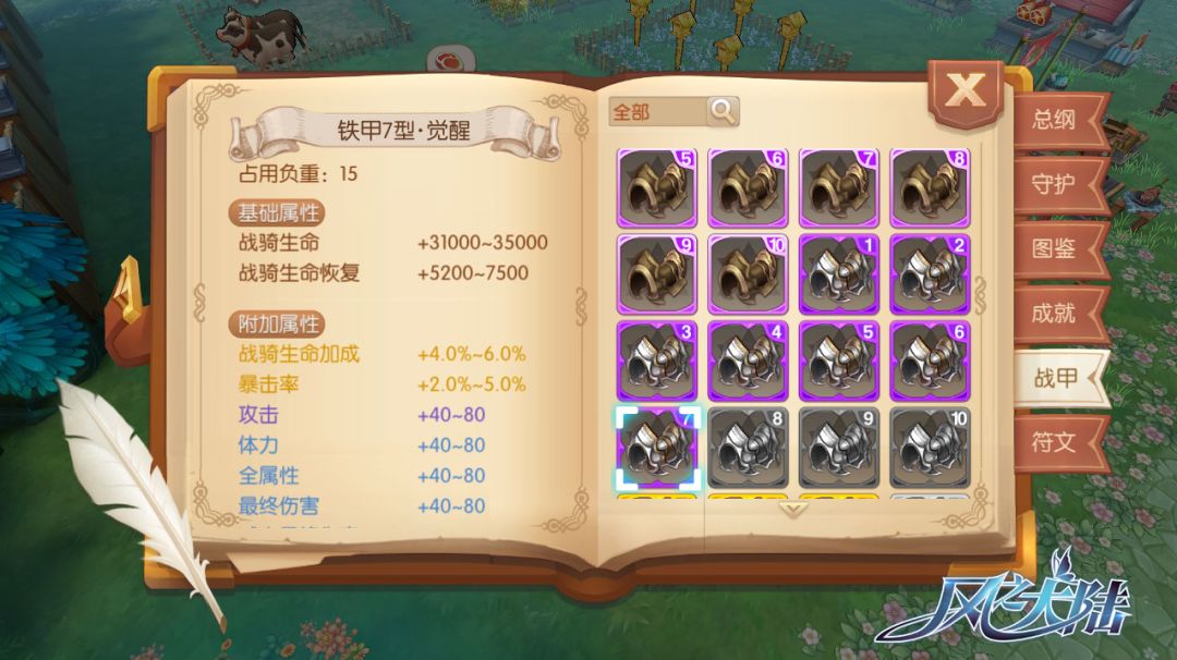 战骑提升到一定等级,会相继开放战甲格子,届时大家即可镶嵌战甲。在天空之城商店或交易所,我们可以购买轻甲、铁甲卷轴,来合成相应品质的战甲。