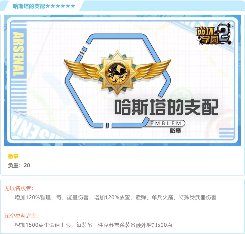大幅度加伤技能。因为是分别增加伤害,因此两者之间可以叠加,例如犹大的誓约能造成能量伤害又是放置武器,因此犹大的誓约带了这个徽章后的伤害将变成2.2*2.2=4.84倍。