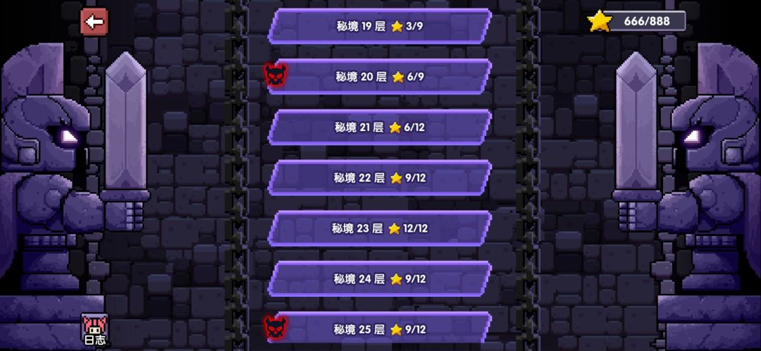 ➻基础情报:20层以前的层数需要上一层3颗星即可解锁下一层,每层最大星数为9颗。20层以后,需要上一层6颗星才可以解锁下一层,每层最大星数为12颗。1分30秒之内通过本层秘境会获得对应秘境的3颗星评价。积累已经解锁星星的总数可以在日志那里领取奖励。比如图中666是已经解锁的星数,888是可解锁的星数。