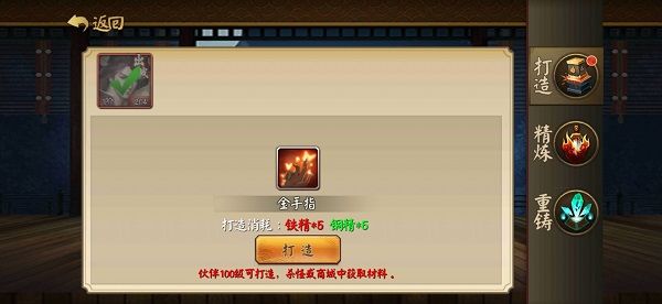 打造:打造专属武器需要一定数量的5个铁锭及5个青铜锭。