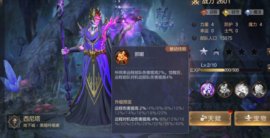 还有一个关乎战局胜负的因素就是英雄的搭配,咱们地下城种族中到底有什么英雄适合争夺王权之眼呢,一个我们地下城最熟悉的英雄,可以说是我们入门的导师,她就是西尼塔,大部分人使用西尼塔时,基本都是驻守大本营,这里我给大家推荐一个新奇的玩法,其主点远程天赋,次点魔法天赋,配合王牌副将罗莎莉输出爆炸,双远程伤害加成,罗莎莉辅助伤害加成,西尼塔魔法伤害加成,光是看到这个加成你就觉得恐怖,西尼塔远程天赋要是觉醒之后加成会更高。下面那张图我们可以看到,西尼塔的远程天赋名为邪眼,这仿佛就是为了暗影凝视者量身定做的,所以我们双远程组合打王权时,只上暗影凝视者就行了,盟友们前排抗住就好,输出就交给我们地下城就行。