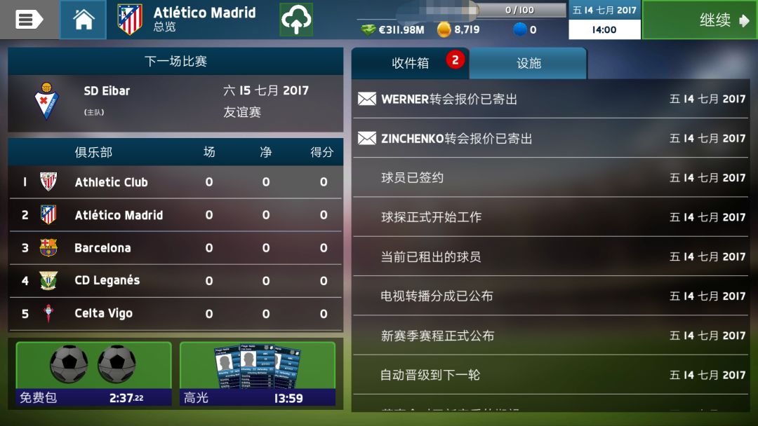 在游戏的一开始,玩家会在右上角的界面发现三种游戏货币,最左边的绿色货币可以大致理解为欧元等,可以用于支付球员的转会费,球员的薪水,建设球场。中间的金币是特殊道具,可以用于强制购买球员,鼓舞球员士气,快速治疗球员的伤病。最右边蓝色的图标标是俱乐部点数,可以在设施一栏中使用。右上角0/100是指玩家的等级,获得一场胜利经验值会增加50,每升一级会奖励俱乐部点数