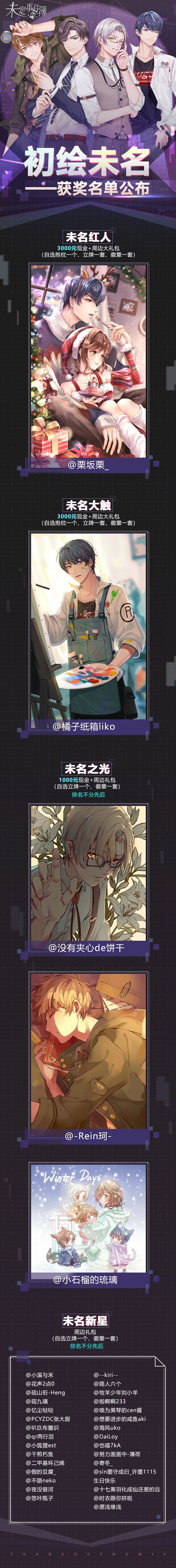 初绘未名同人征集大赛结果公布!感谢每一位投稿的太太,以及所有参与点赞投票的律师!这段时间内,我们看到了许多优秀的同人作品。无论是唯美细腻的插画、脑洞有趣的短漫、还是温馨可爱的Q版,都给我们留下了深刻的印象,非常感谢大家的热情!官方评审团经过了激烈的讨论,最终评出了1位“未名大触”,3位“未名之光”以及30位“未名新星”;
