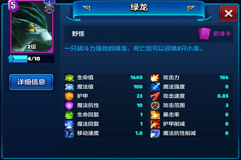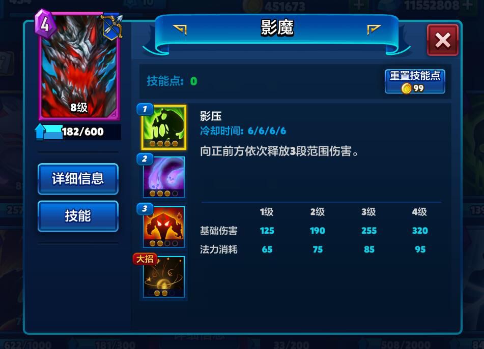 说完了界面,我们来说一说魔霸对决里面的卡牌种类。不同于皇室战争,魔霸对决里面的卡牌种类采用了moba类游戏中的设定。卡牌包括:英雄、小兵、野怪与技能。我们先来说英雄。每个英雄都有4个技能,升一级会获得技能点用来升级技能。如下图所示,ps:这个英雄是不是非常的熟悉
