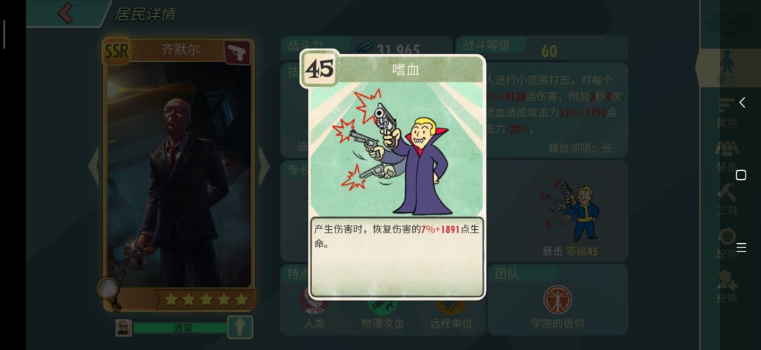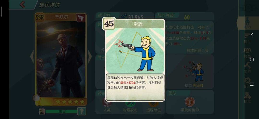 首先我拿出一个满星满级齐默尔让我们来看看他的技能锁定血量最低敌人进行小范围打击对每个敌人造成攻击260%+4138的伤害,附加3秒4次的流血效果,流血每次造成攻击15%+1191点伤害 并使其目标攻击力减少20%。这个技能比较全面伤害也不俗容易打击后排配合齐默尔的小技能滑膛能快速收割敌人后排