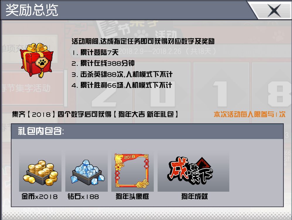 活动内容:活动期间,达成指定任务获得对应数字,集齐数字【2018】即可获得奖励