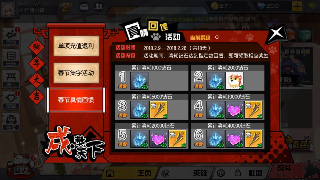 2> 累计消耗钻石数量2000,获得奖励狗年奋斗头像,水晶石x20