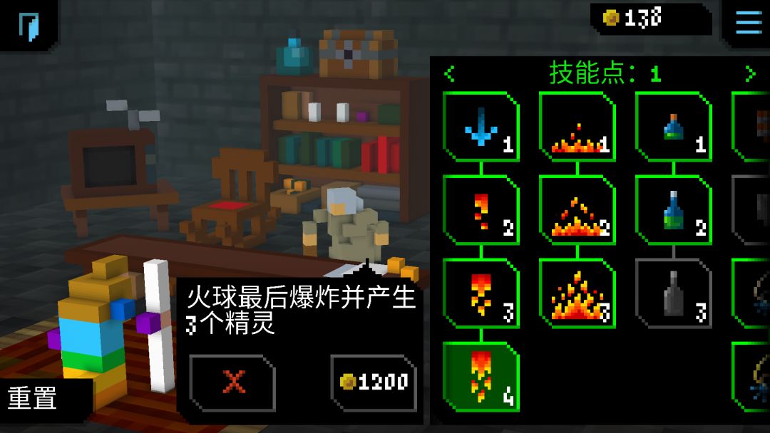 后空翻:直线射一个火球,距离1-3,满级时火球在终点炸出火精灵!