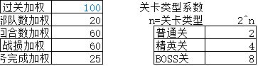 =过关加权*关卡类型系数+关卡标准部队数/实际上阵部队数*部队数加权+关卡标准回合数/实际过关回合数*回合数加权+(1-战损部队数/关卡标准部队数)*战损加权+任务完成数*任务完成加权