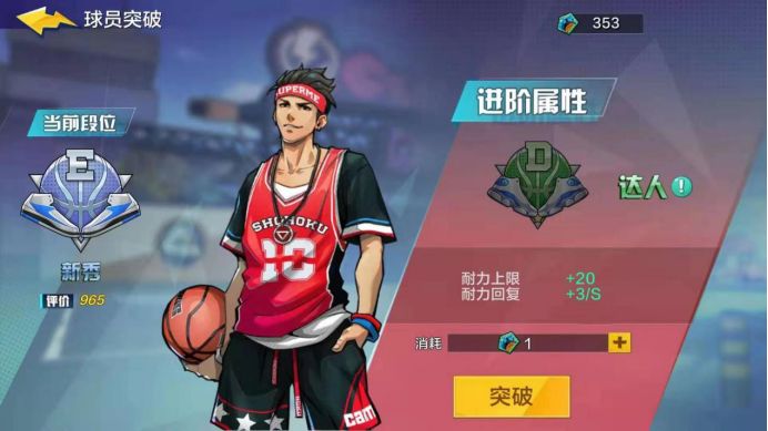 球员突破需要用到突破卡,根据球员的等级不同,需要的突破卡种类不同,俊也作为最基础的球员,突破起来很简单。