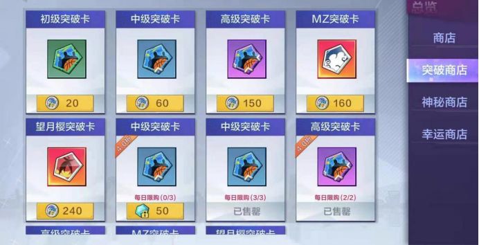 突破卡可以在突破商店里用绑定钻石购买或者通过回收一些用不到的突破卡获得的突破币购买,初级突破卡还是很好获取的。