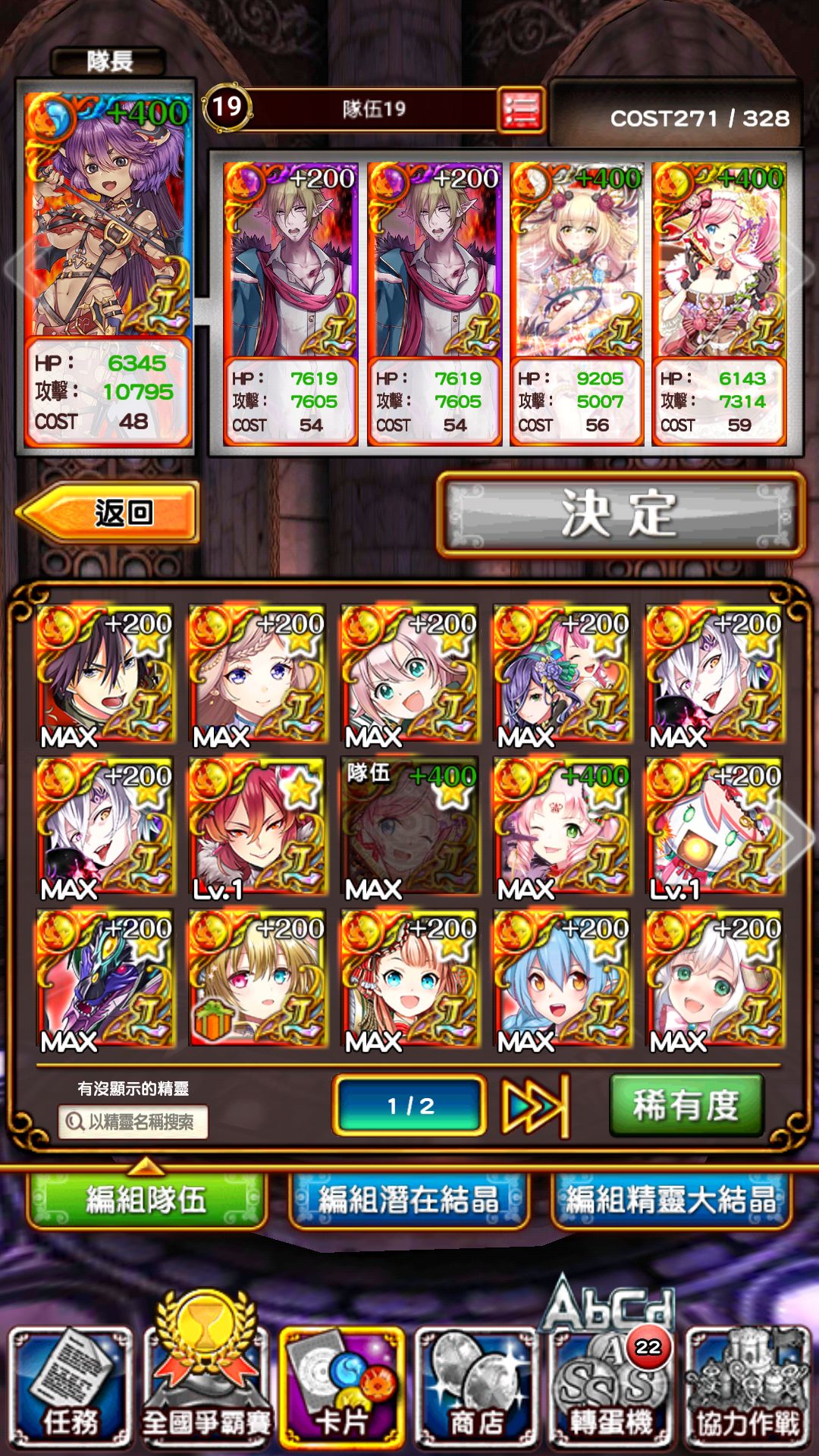 如图,主力是双艾斌和图鉴优奈娃,露席菈和法姆凑属性