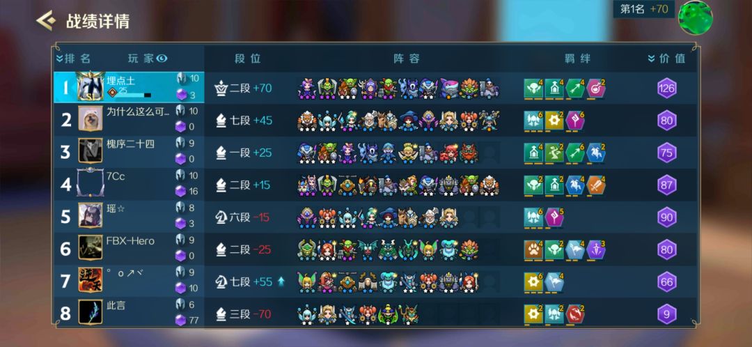 图片不是秀第一,这个但凡上个黄金钻石,肯定一堆第一的截图。图片想说的是,无论你到哪个段位,你匹配的都不会是只有你段位。按照段位越高实力越高这个不负责任的很容易被骂死的强盗逻辑,你只要确保你有一套稳定强度阵容,你就能至少保证你可以得分(前四),因为你永远能匹配到没你段位高的,想得分,正常发挥就行了。