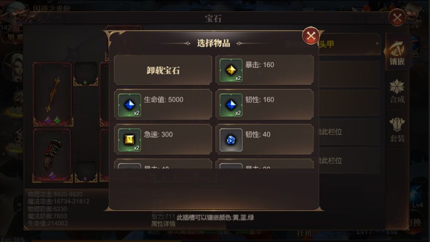 根据槽位属性可对应可安装相应的宝石,各属性宝石针对不同职业具有不同程度的战力提升。