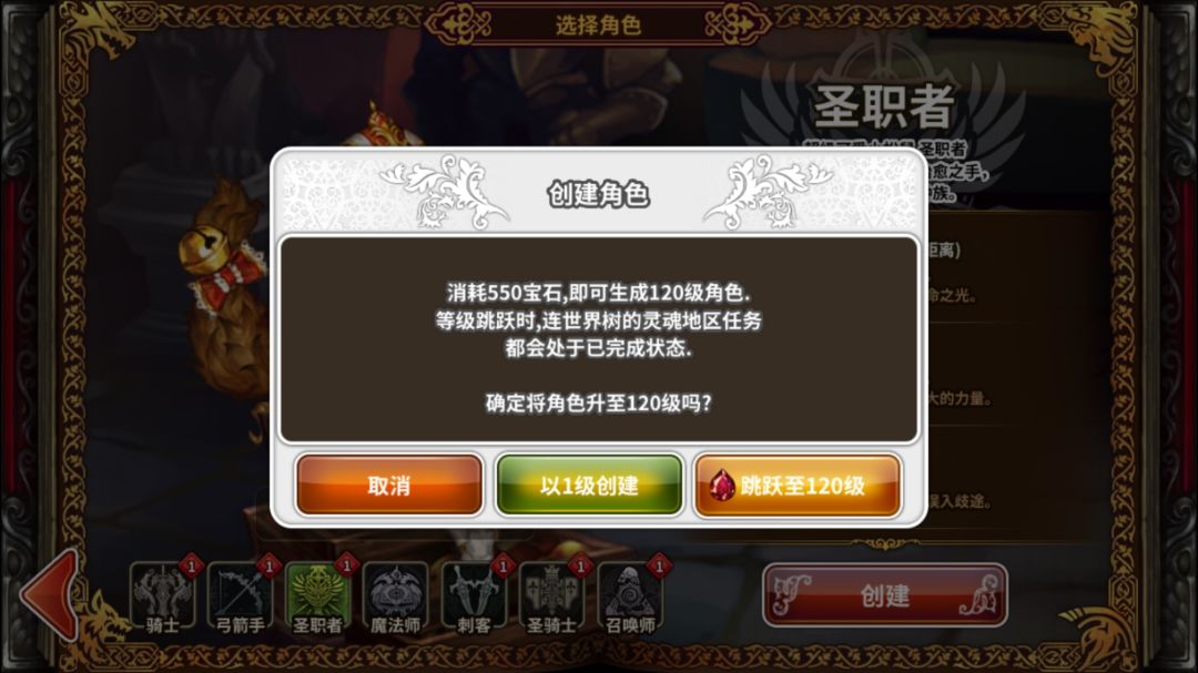 1.创建角色直接开始120任务(第一次免费后续消耗一定的宝石)