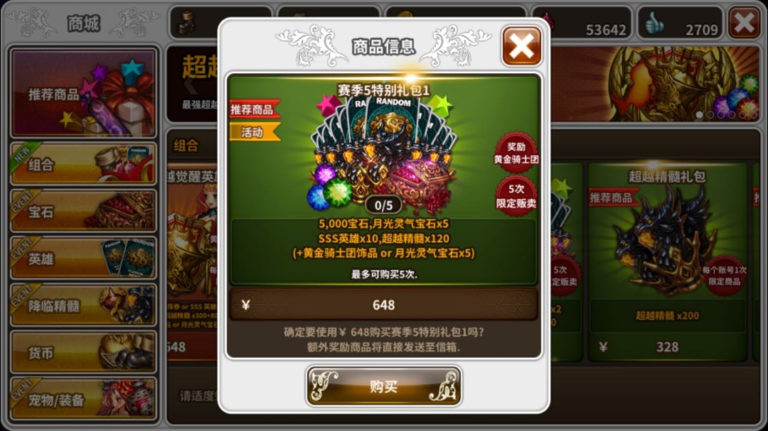 >¥648:宝石5000,月光灵气宝石*5,SSS英雄10,超越精髓120个