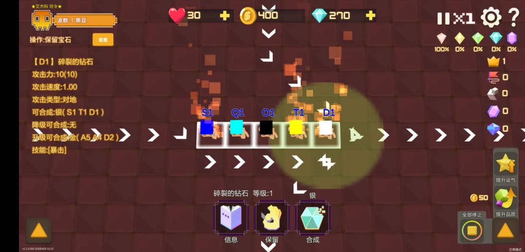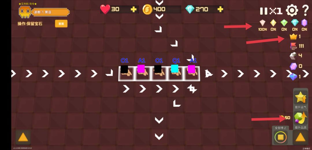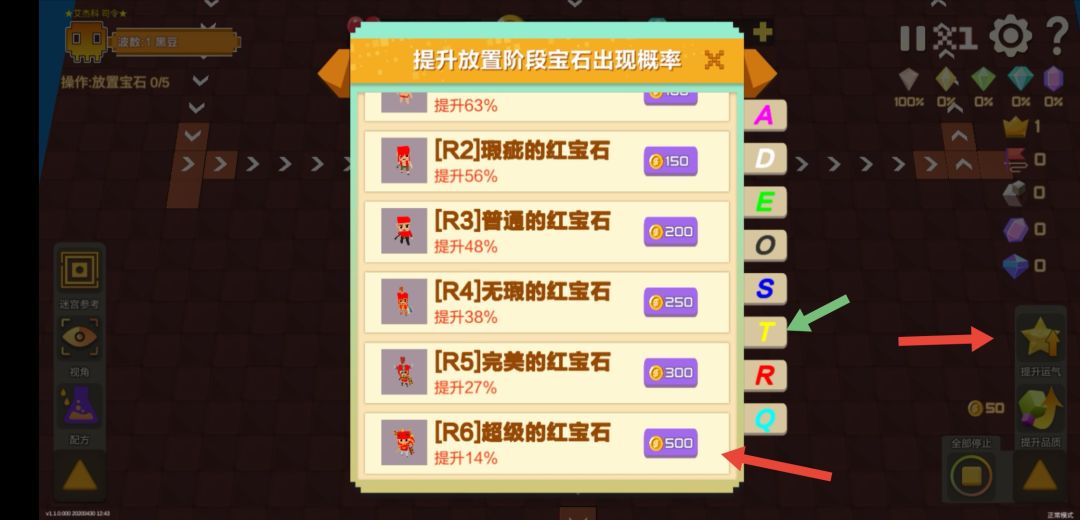 要提醒的是①同一波次仅1次有效,所以一般是在最后一个时考虑是否提升概率;②既然是概率,就有连续失败的可能;③除第一波外,同一波出现过的宝石顺序和品质不会变化,所以即便对提升概率的结果不满意,那也没办法,继续游戏吧。