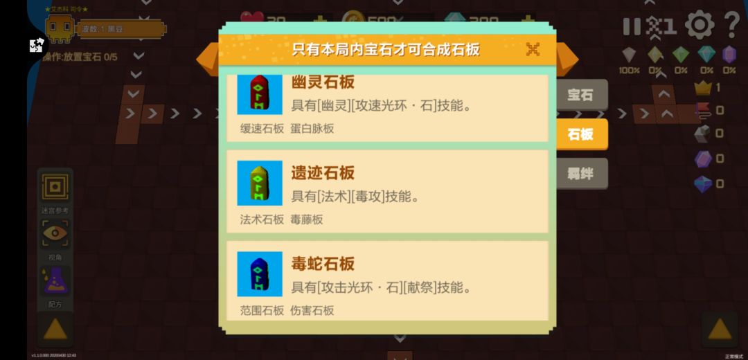石板分两种。初级石板要求在同一波次内符合条件才能合成,不能像前面介绍的“合成宝石”那样分3次保留再合成。高级石板是由2个初级石板合成而得,没有同一波次的要求。