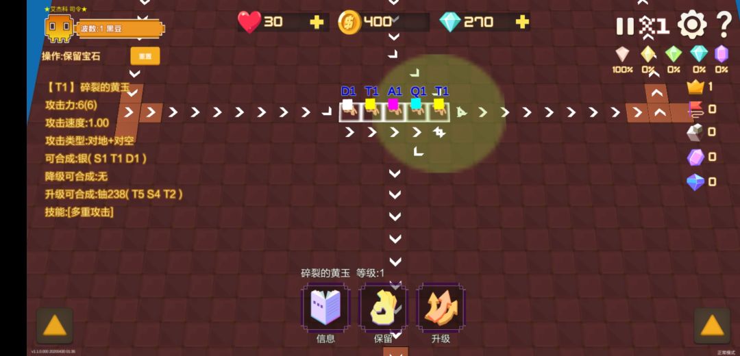 上图中,2个T1就可以升级成T2并保留。游戏中,6级宝石就可以通过相应颜色的2个相同的5级宝石升级或4个相同的4级宝石超升级而得;幸运石(最强宝石)则只能通过任意同色的4个5级宝石超升级而得。以上有点绕口,但实际并不麻烦,在游戏中体验一番即可理解。