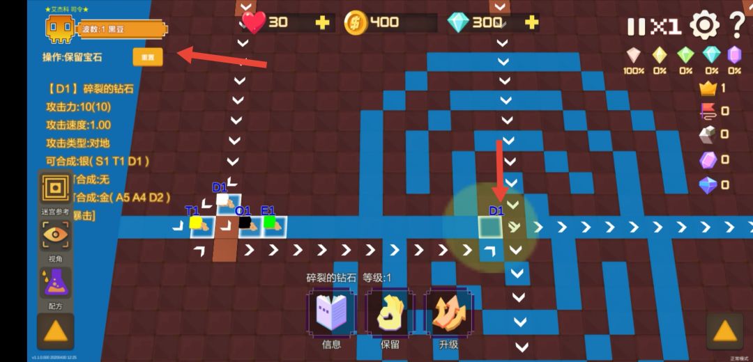 在搭建过程中有一个十分重要的操作需要掌握,那就是通过左上角的“重置”按钮重新摆放宝石,以把需要的宝石尽量留在中间。如下图中要保留升级后的D2。要提醒的是,重置和S/L不会改变宝石的种类、品质和出现顺序,以及后面会介绍的“赌石”结果。