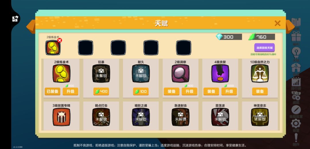 “天赋”也就是全局增益,最多可带5个,但天赋格需要用钻石💎解锁。新手建议带一个2级炼金术(如图),方便开局“赌石”。其他天赋中,(目前来看)放置专精、自然之力、贪婪比较重要,之后版本变化另说。