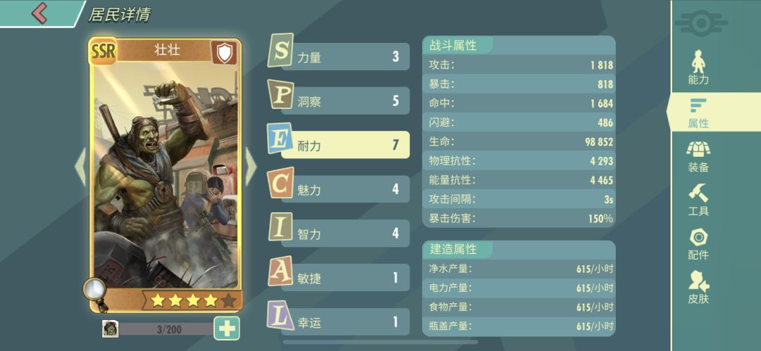 壮壮的面板属性,其中耐力达到了7,换句话说就是血量比较多,那么我们加配件注意增加它的血量,坑性。