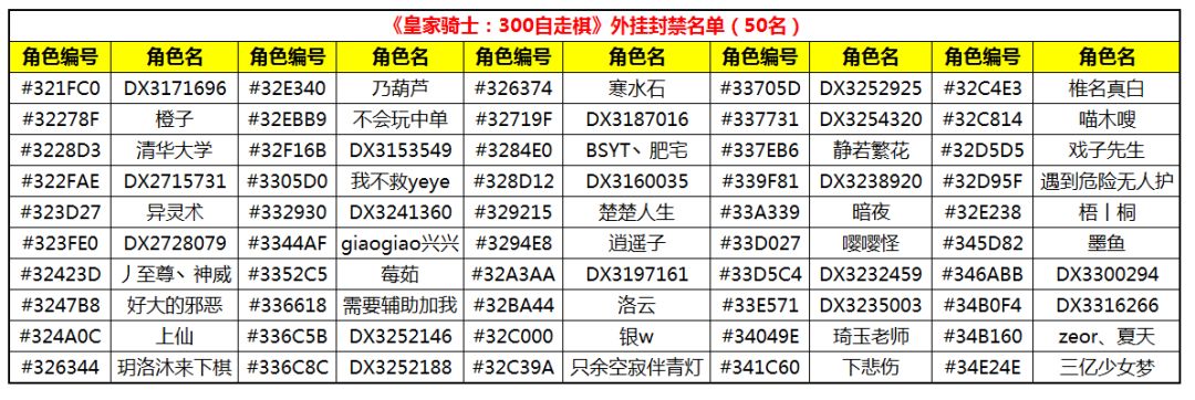 根据大家的反馈和官方技术人员的核查,现核实有以下50名玩家使用外挂,对游戏内环境造成不良影响,我们已给予封禁处理(封禁名单如下),希望大家都能严格遵守游戏内秩序,和我们共同打造公平的游戏环境~我们也将加强外挂排查力度,一经发现,立即封禁,感谢大家的配合~
