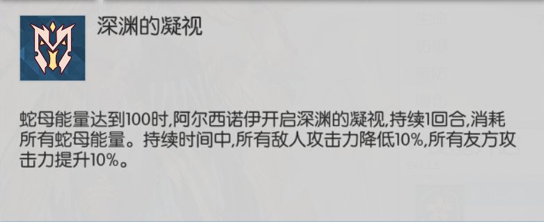 深渊的凝视(效果):蛇母能量达到100时,阿尔西诺伊开启深渊的凝视,持续1回合,消耗所有蛇母能量。持续时间中,所有敌人攻击力降低10%,所有友方攻击力提升10%。