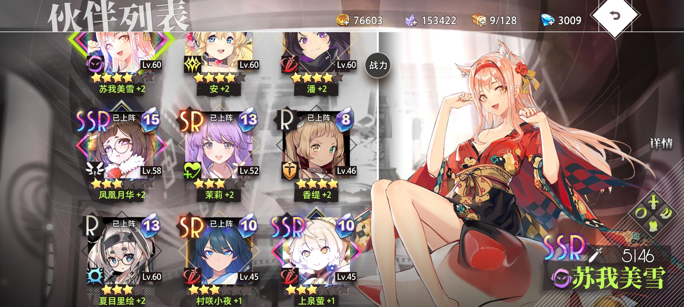 美雪是我主力,很看下卡时机,我这可以打到挺远的吧,暂时没卡关,没体力了。再来个美雪我就抽装备了。安姐姐要五星了,还是挺好用的。香缇应该能排r卡的中上水平了,无敌十五秒,能应付很多场面,竞技先下潘,然后下香缇保主角,很好。竞技也是没卷了,只打到第九,随便撸超一万战力的。