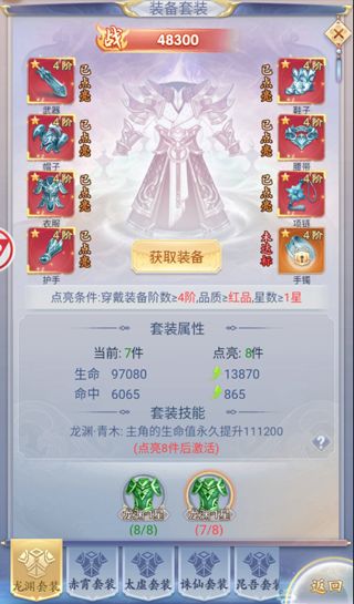 激活套装的方式主要是靠点亮每个部位的装备,点亮条件分为装备阶数、装备品质以及装备星数三部分,三者条件缺一不可。装备一旦点亮后即可获得套装属性的加成,每套套装共可以加成8次。
