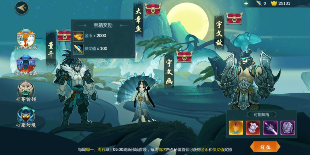 下面呢,江湖哥给大家说一下白帝城的奖励机制,首先白帝城每个首领被击杀后会出现一个箱子,箱子内包含一个朔语套装牌子和一个紫色的散件装备,装备是以拍卖的形式交易的,价高者得,未拍到装备的剩下7名侠士将会收到拍到装备侠士给予的工资,工资从拍卖装备的金币里由系统自动分成。大章鱼是白帝的最后一个boss,比较独特,不出套装牌子,一般是出两个紫色的散件装备加一个紫色的武器,不过对于运气好的侠士可能会出未打造的飞仙玄晶哦,配合天外陨铁,通过打造后可以兑换橙色武器哦~