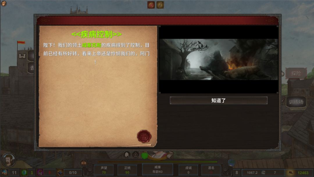 疾病的发生目前有两种,一是领地自然爆发疾病。二是领地被传染爆发疾病。在爆发疾病时,领地内人口会按照轻重疾病进行人口减少,每一次领地发生疾病会按照轻重程度给与一定的疫情最大上限时间。像黑死病这种蔓延整个欧洲的重大疾病疫情上限的时间会比较长,但是不代表不会消失。在疫情时间内,依靠封地内的医院数量以及其他事件依旧还是有几率可以治疗的。当然黑死病这个在当时的顽固派疾病那是真的几率太低了。游戏中的疾病会蔓延传染周边相邻的领地,相邻的领地被感染的越多,那么被传染几率也就越大。保证充足的粮食,医院和教堂越多,发生疾病的几率越小。如果领地没了粮食,大幅度增加爆发疾病几率。贸易站虽然可以带来高收入,但是人口流量大导致疾病发生和传染几率增加。