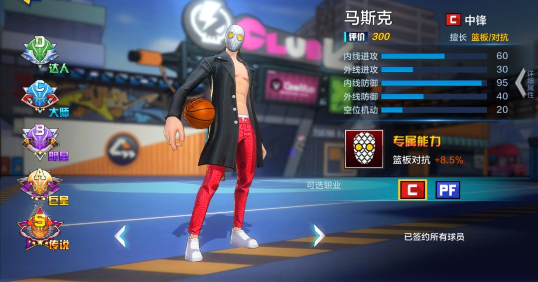 上图热血神秘人自己把最后5个属性点选择分配到了上篮扣篮能力上,不过热血神秘人觉得最后的一点属性值也可以分配到篮下投篮能力上,不过大家还是根据自己对C位马斯克这位球员的理解能力分配就好。