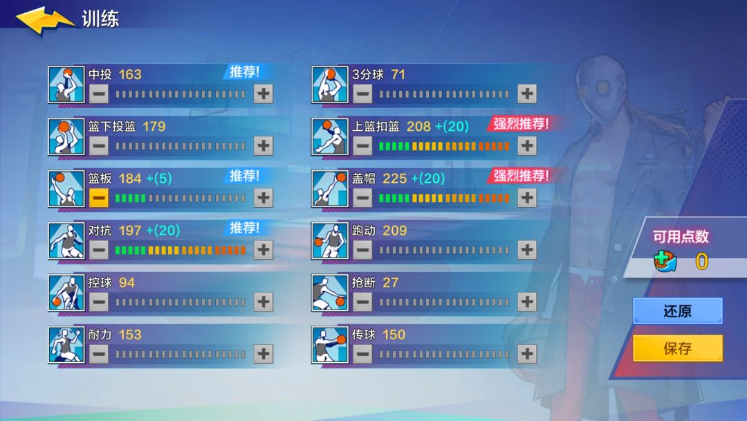 PF马斯克本身就是一位擅长盖帽和扣篮的球员,所以热血神秘人在技能组搭配上推荐大家可以配带扣篮强化,扣篮集中,强力盖帽,盖帽传球,盖帽 抓球,不屈意志这几项技能,其他的剩余技能位置大家可以根据自己的理解自由搭配。