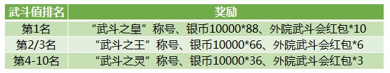 每天前6场武斗会中,每胜1场获得30武斗值,负1场获得10武斗值,每击败一个斗者获得1武斗值。参与10场、20场、30场以及胜利1场、5场、10场分别可获得奖励,奖励包括健肌散、灵力丹、祈雪令等。活动结束后,武斗值排名前十的斗者可以获得特殊称号、银币、外院武斗会红包奖励。