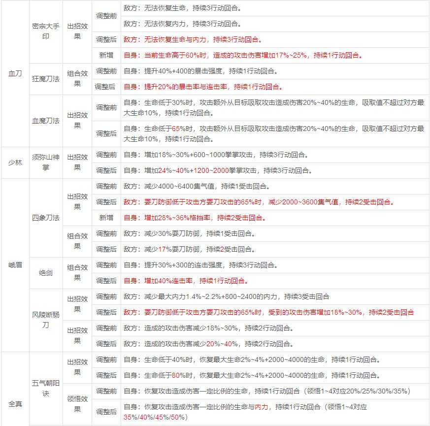 11.优化了部分门派金色和红色武学(具体内容请看下表,因涉及到部分门派武学调整,本次维护后将全服发放重置丹*1,后悔药*1)
