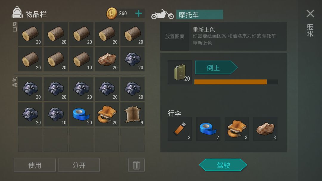 1.带齐所需装备(摩托可放4铁斧);