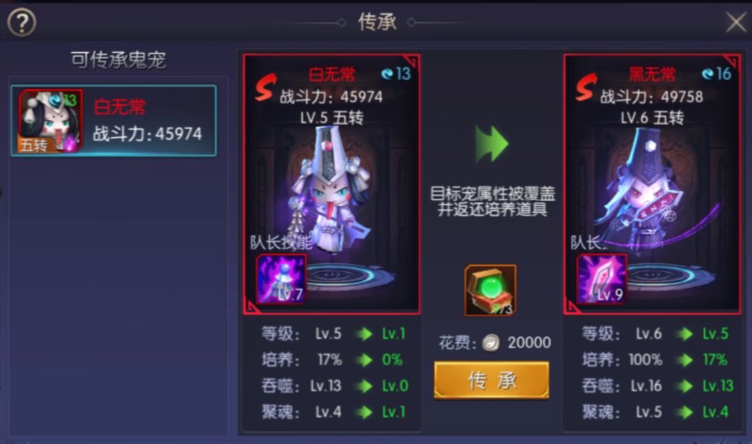 鬼宠五转后,同品质鬼宠现可相互传承强化,新旧鬼宠实现完美承接,培养鬼宠更省心,材料无损随便花!
