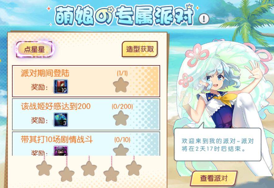 进入派对后可以在左侧看到当前战姬的星星任务啦,在完成相应的任务条件后,该任务的背景色会变为橙色,这时候学长点击任务就可以点亮星星哦~