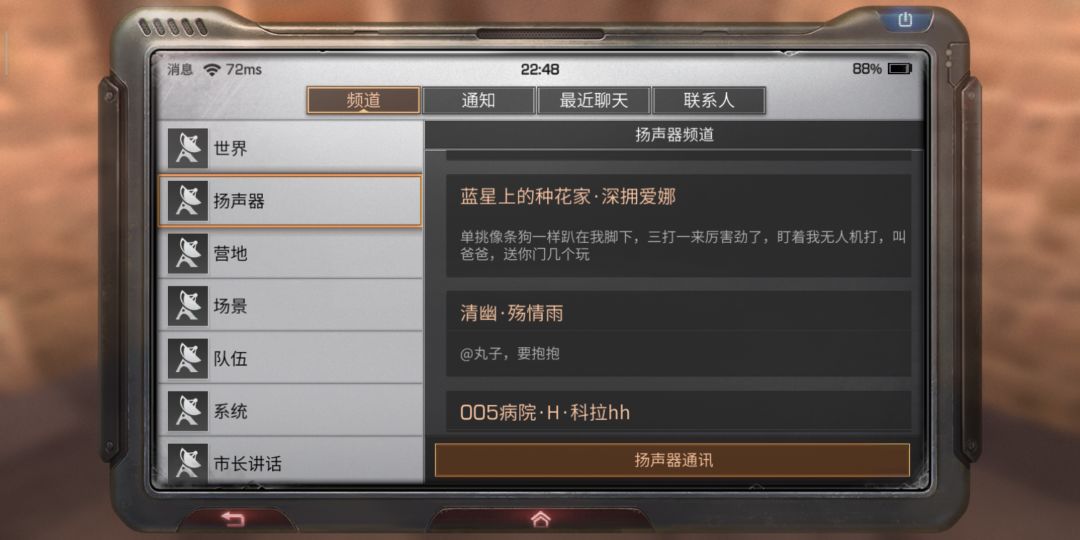 打完以后他就在场景口嗨起来了,说什么营地不行,无人机就是个玩具随便玩不心疼。有本事远星城走一波。结果他在喇叭里面只字未提。(这个人啊,为了装逼啊,可能是遇到我了,可能是知道打不过我,我一直在哪说叫他和我互点两枪看看伤害,结果他全程口嗨,偶尔怼一下我们其他的那些人,反正就是无视我。中途我们营地有个人过来看热闹,就说了句你妈买菜必涨价,他到起劲了说什么五百多送人次数啊,是个连远星城都不敢去的种子选手啊之类的。)