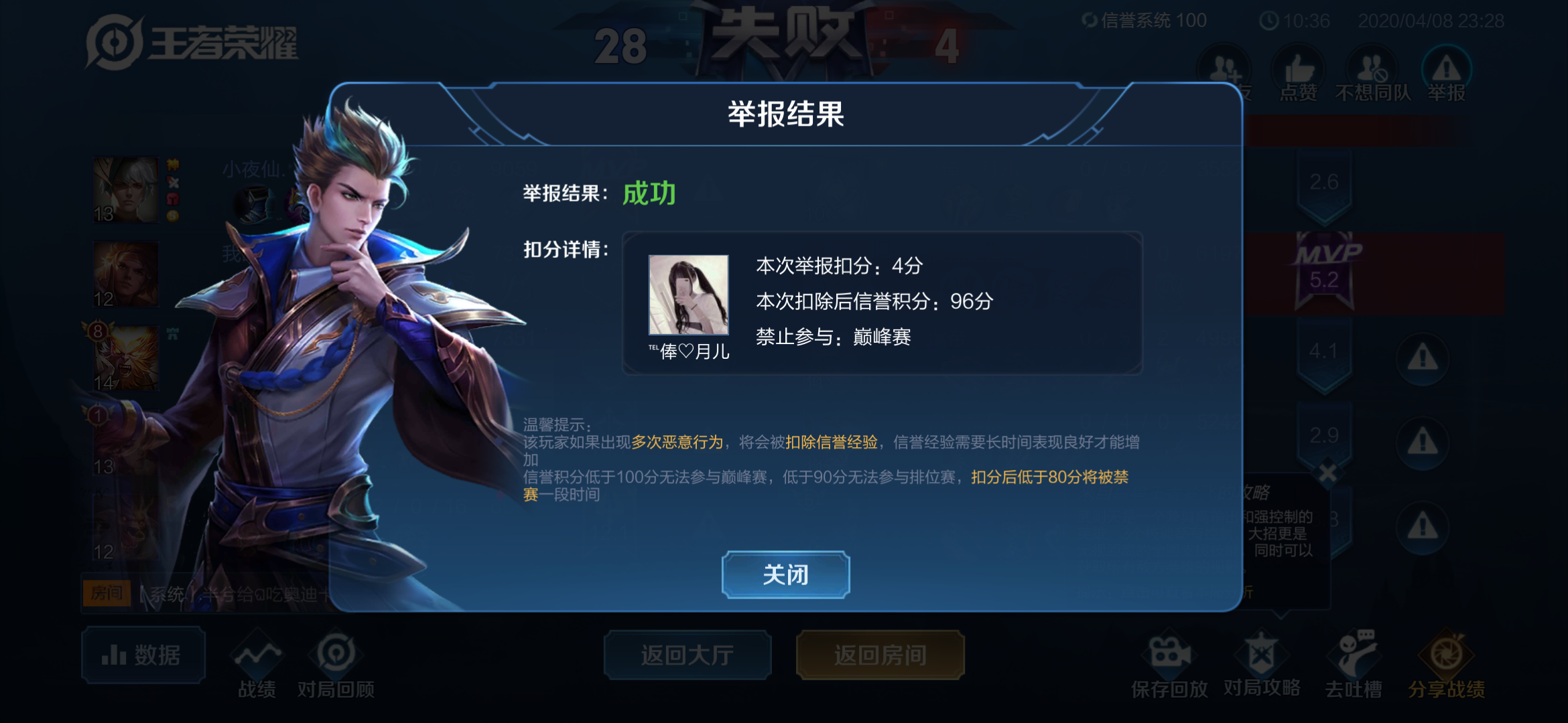 这一局游戏真的很难,五楼在队友选英雄的时候一声不吭,然后剩一个辅助位很正常吧,他就拿个绿色的东皇就开始演了。最后这一局也是理所当然的输了,点举报也是扣了四分,可是这真的有用吗?有个锤子用,别人甚至可以直接就开下一局游戏,打了四局分又满了,那这扣分有什么意义呢?