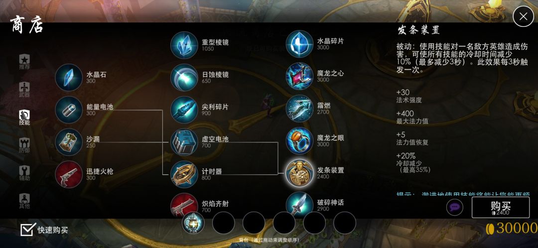 3.发条 这里重点说一下这个发条,萨缪尔的2技能在点满5级后只是单纯提升只是范围与基础伤害,冷却cd是永恒不变的26秒,那么26秒一个2技能,你才能在暗黑漂流里利用加强1技能来消耗甚至击杀敌人,那么问题来了,一分钟只能放两个2技能在随时可能开团的中后期作为一个法师来说实在是利用率急低的,这实在是交不了货。。。那么发条能够解决这样的问题。首先发条的被动是一但技能击中敌方英雄都会有技能的cd瞬间减少无论你是用的1.2.3,但凡是技能击中敌人就可以减少几秒的所有技能冷却,释放2技能打团时候不可避免敌人会有人碰到暗黑漂流圈,或者你的1技能,那么发条被动触发,减cd,这时你会发现前一个2技能刚刚放完,没1.2秒你的2技能又可以释放了,加上发条本身附带一个20%的cd缩减,那么萨缪尔的2技能cd已经被从26秒的cd变为23秒。配合后期的海鲜充能靴的减cd和本身发条所携带的最大法术值提升,你也不会蓝不够用。