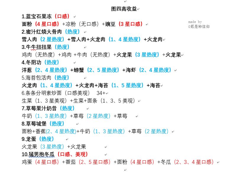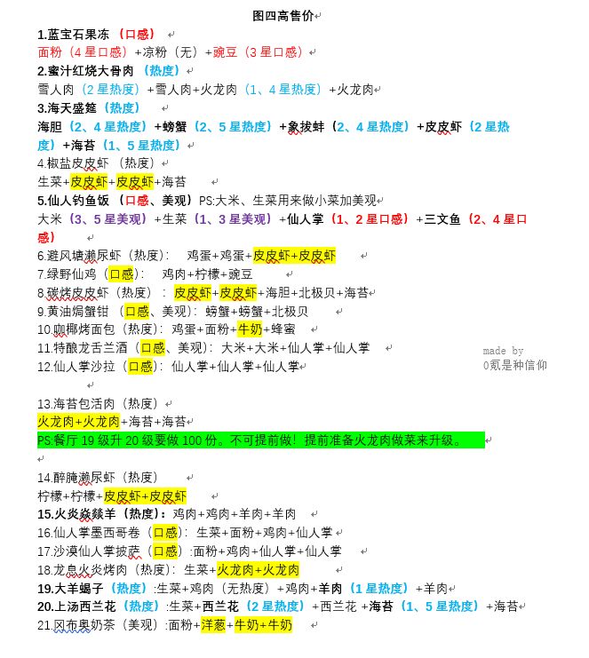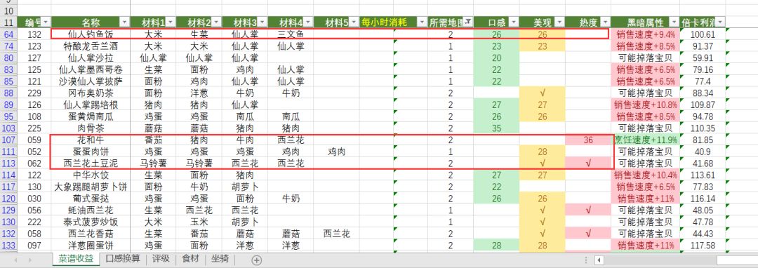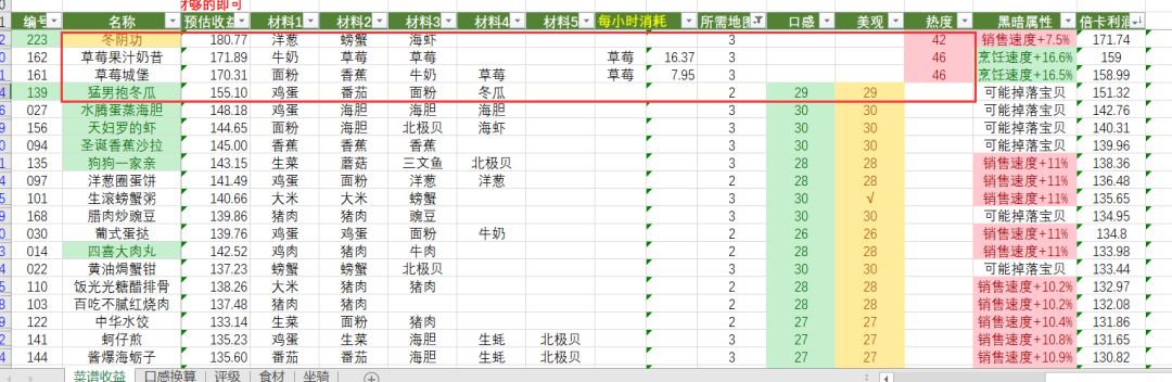 以下菜谱高收益/高售价都是从高到低排名,加粗为推荐菜谱(部分考虑前期饲养场等级低缺少食材时优先考虑最高售价或最高收益)。