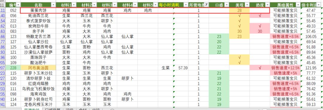 写在前面备注一下,口感菜的比较前提是口感加满,所有皮肤优先加口感,除了大米、生菜、番茄之外(用来做抱抱饭团和白糖拌西红柿美观属性快速增加食客)。皮肤的加成是额外的,是回炉满属性可以额外增加的。